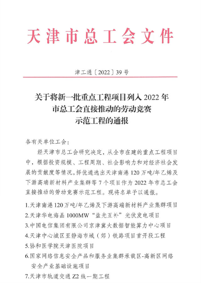 公司天津網絡安全中心項目獲評2022年天津市勞動競賽示范工程