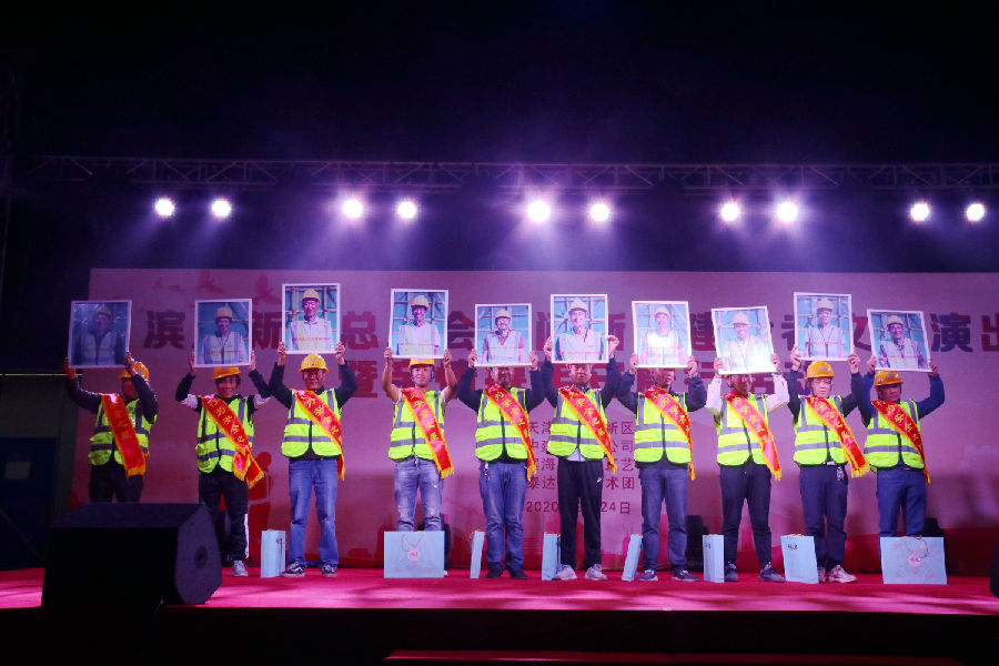 激情澎湃的開場歌舞《圓夢中華》中拉開演出序幕。歌舞組合、原創(chuàng)歌曲、評劇藝術(shù)、相聲表演、快板說唱等豐富節(jié)目形式讓現(xiàn)場的觀眾耳目一新,烘托出濃濃的節(jié)日氣氛。抗疫原創(chuàng)歌曲《媽媽 我為你撫平壓痕》真實反應(yīng)了疫情中醫(yī)務(wù)工作者舍小家顧大局的無私情懷和不懼危險,勇于奉獻的精神力量,讓現(xiàn)場觀眾紛紛感動落淚。一曲歡快的《工地飛來一只百靈》,歌聲悠揚、韻味十足,把祝福的歌聲唱響了工地的每一個角落,與現(xiàn)場一線建設(shè)者的掌聲融為一體。