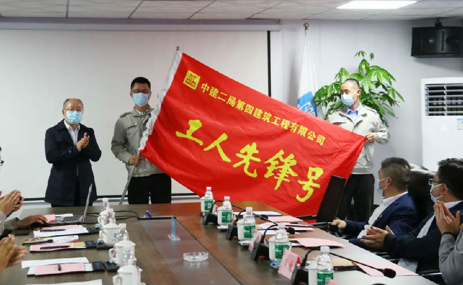 濱海新區(qū)總工會副主席李慶國為天津網(wǎng)絡安全中心項目工人先鋒號授旗;